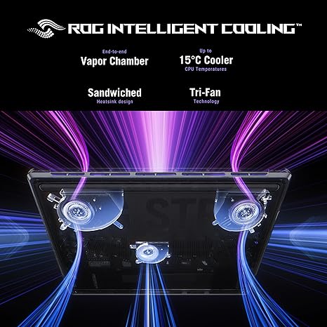 - STATE-OF-THE-ART ROG INTELLIGENT COOLING – ROG’s advanced thermals keep your system cool, quiet and comfortable. State of the art cooling equals best in class performance. Featuring an end-to-end vapor chamber, tri-fan technology and Conductonaut extreme liquid metal applied to the chipset delivers fast gameplay.